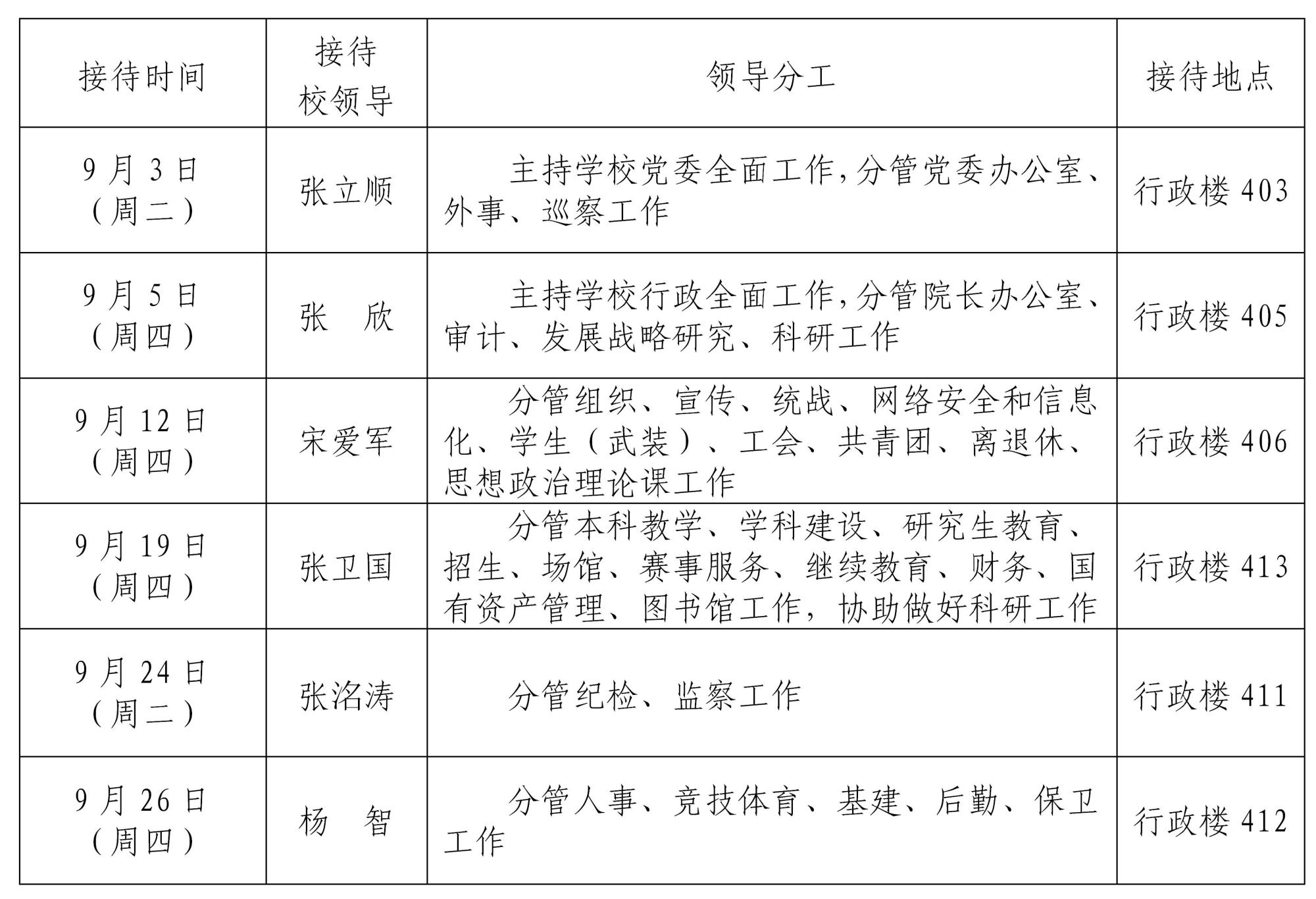 根据《beat365中文版官方网站领导干部接待日制度》规定及学校近期工作安排,现将2024年9月校领导接待师生来访安排通知如下:相关事项: